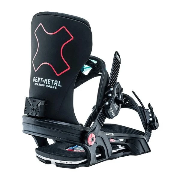 BENT METAL 2023 STYLIST SNOWBOARD BINDING It not hard to figure out what the Bent Metal Stylist Snowboard Bindings are all about. With a selection of designs from sleek black to funky retro, they’re certainly stylish to the eye. And with a softer all-mountain flex and powerful uni-body chassis, they enable riding that lets your own kinetic steelo shine. These bindings are dripping with style and jam packed with performance, destined for days of creative riding on all aspects of the mountain. Flex Flex Rating 6.5 (1 Soft – 10 Stiff) Baseplate Magnesium Fiber Drive Plate Fiberglass panels in the footbed create specific flex patterns similar to your snowboard for personalized binding response. The dynamic energy of the advanced composites gives you a flex control advantage like no other binding can. Uni-body Chassis The uni-body polymer design absorbs vibration for a smooth ride. It features adjustable toe ramp and a large axis disk with toe heel centering in the disk. Highback Performance Polymer Highback 6 10 Flex BMBW Revolutionary Cube The BMBW Revolutionary Cube is the worlds fastest tool free forward lean adjuster. Simply spin cube for the desired forward lean angle. It s fool proof. Angle Range: 10 , 14 , 18 , 22 . Easily adjust and experiment while on the hill. Urethane skateboard wheel construction absorbs shock and vibration. Visual indicators let you know angle selected. Straps Grip Form Toe Strap Features a secondary flexible panel that forms to any boot for maximum grip. Dual Band Ankle Strap Soft A smaller surface area with a large cored compression window creates a soft and extra comfortable flex great for all mountain riding. Buckles Forged Aluminum Buckles Hardened for ultimate strength. Lightweight with smooth entry and release.