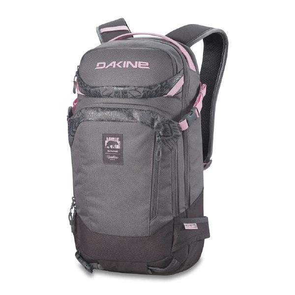 DAKINE WOMENS TEAM HELI PRO BACKPACK Jamie demands a lot out of her equipment, and her pack of choice proves no different. A slimmed-down, women’s specific version of our popular 24L offering, the Team Women’s Heli Pro 20L is ready to take on everything from the backcountry or the daily office commute. With its multiple board carrying options, dedicated snow tool sleeves, and a hydration pouch that doubles as a 15 laptop sleeve off the mountain, this pack proves just as versatile as its signature namesake. Speaking of which, Jamie’s contrasting colorway adds just enough flair to set it apart from the pack while still looking subtle enough when strolling into the office. Limited Lifetime Warranty Zippered closure Includes Dakine sticker sheet Women’s specific fit Vertical snowboard carry Diagonal A-frame ski carry Horizontal snowboard carry option Quick dry mesh padded back panel Snow tool shovel pocket with sleeves Large fleece lined goggle pocket External quick-stash pocket Internal mesh pocket Hydration Laptop sleeve fits most 15 laptops 38mm web belt Rescue whistle on sternum strap