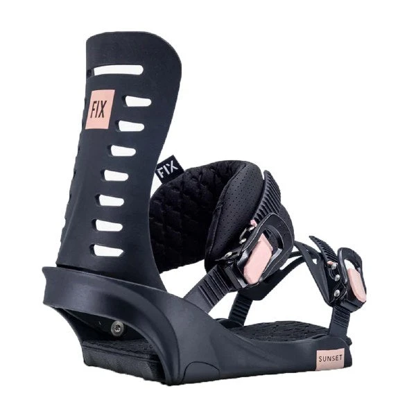 FIX BINDING CO 2023 WOMENS SUNSET BINDING 14 Glass Injected Nylon Baseplate 14 Glass Injected Nylon Highback Memory Gel Ankle Strap No Nonsense Forward Lean Cast Aluminum Buckles Ladder Saver Buckles Tool Free Strap Adjustments Easy Highback Rotation EVA Footbed Padding Regrind Free Injection Moulding First Shot Pure Nylon Paint Free Nylon Lifetime Warranty on Buckles Lifetime Warranty on Baseplate Regrind Binding Box Regrind Wax Scraper Hardware Card 4×4 and Channel Mounting Hardware 4×4 and Channel Compatible Discs