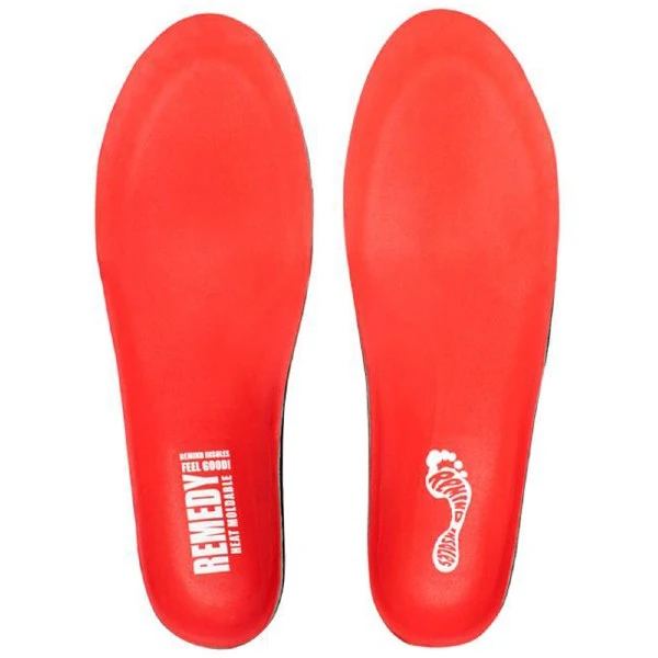 THE REMEDY has a Four-layer foam impact rebound system made up of the highest quality materials built to withstand every type of footwear abuse. Its anti-microbial and anti-friction fabric systems reduce hot spots and blisters, keeps the feet cool, dry, odorless and gives you excellent foot grip for enhanced control and stability. KEY FEATURES: HEAT MOLDING: Heat Molding technology custom molds to your specific foot details for intricate support and even weight distribution. PROPER ALIGNMENT: Remind insoles are engineered to support your foot’s natural movements by aligning your body’s joints and alleviating stress. The ankles, knees, hips and spine will fall into straight alignment when the foot and arch are supported with the Remind orthotic shape. BLUE MAGIC: Blue Magic is a state of the art shock absorbing smart foam that will out-perform any other product on the market. Blue Magic can absorb massive amounts of energy while maintaining a soft feel. Not only is it built for heavy impacts, but it’s also extremely durable and won’t pack out or wear down. HIGH PERFORMANCE: Lightweight, high performance, responsive, and durable material that provides high energy return and doesn’t break down. ANATOMICAL ARCH SUPPORT: Semi-rigid insert that flexes perfectly with your foot’s mechanical movements that’s been bio-mechanically engineered for proper anatomical alignment. This enhances your performance and provides joint pressure relief. ANTI-MICROBIAL: Anti-microbial, anti-friction system that reduces hot spots, keeps feet cool, dry, and odorless. MOISTURE WICKENING: Every insole has a 100 organic treatment that wicks away moisture and odor, leaving your feet dry and smelling good. FOUR TECH CONSTRUCTION: Four layer construction that absorbs shock, ensures lasting wear and provides structural support. Heat Mold Instructions: 1.) Pre Heat Oven to 200 F or 94 C 2.) Place in oven for 2-4 minutes 3.) Remove from oven and Place into Shoes or Boots 4.) Stand hip distance apart for 2 minutes