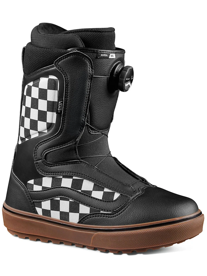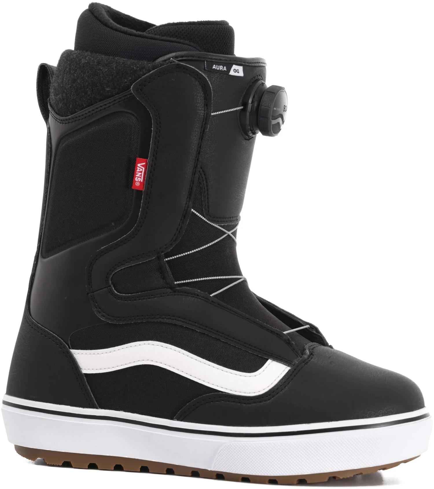 VANS 2023 MENS AURA OG SNOWBOARD BOOT Simple, lightweight, and effective. The Vans Aura OG Snowboard Boots provide the durability and performance you need out of an all-mountain boot, but with a pared-down design that doesn’t distract itself with all of the bells and whistles. The single Boa system will have you dialed in for a good time, and a forgiving flex and super comfortable liner will help you get the most out of any style of riding. Flex Flex Rating 4 – 5 (1 Soft – 10 Stiff) Instep Flex Zone The Instep Flex Zone functions to maintain natural ankle flexion in your boot, whether in or out of your bindings. Fit Pleasurecuff The supple elasticity of the PleasureCuff delivers a cushioned, comfortable fit that keeps your calves supported. Liner V1 UltraCush Liner The V1 liner is amazingly simple, delivering comfort and essential support in a streamlined design. It is Vans’ most flexible liner, built to be functional and forgiving for riders of all levels. V1 Boot Harness Vans’s lightest and most simple harness is designed to ensure effective support and heel hold when paired with the V1 liner. Lacing System Vans Boa Coiler This tongue-mounted single reel system utilizes a spring-loaded spool to automatically retract cable slack for quick and efficient closure. Cable guides are designed to optimize closure force in specific areas of the boot. Footbed V1 POPCUSH Footbed Single-density POPCUSH construction 3D-molded anatomical shape Airflow perforations Nylex moisture-wicking top sheet. Sole V1 Waffle Lug The original Vans waffle outsole is an iconic skate classic. And with the introduction of the V1 Waffle Lug outsole, Vans pays tribute to the timeless vulcanized look that put them on the map. Additional Features Heat Retention 360 All Vans snowboard boots feature a newly improved thermal retention layer that provides a 360 wrap of the toe box and between the outsole and the liner. This essential layer keeps heat in and cold out, ensuring all-day warmth and comfort.