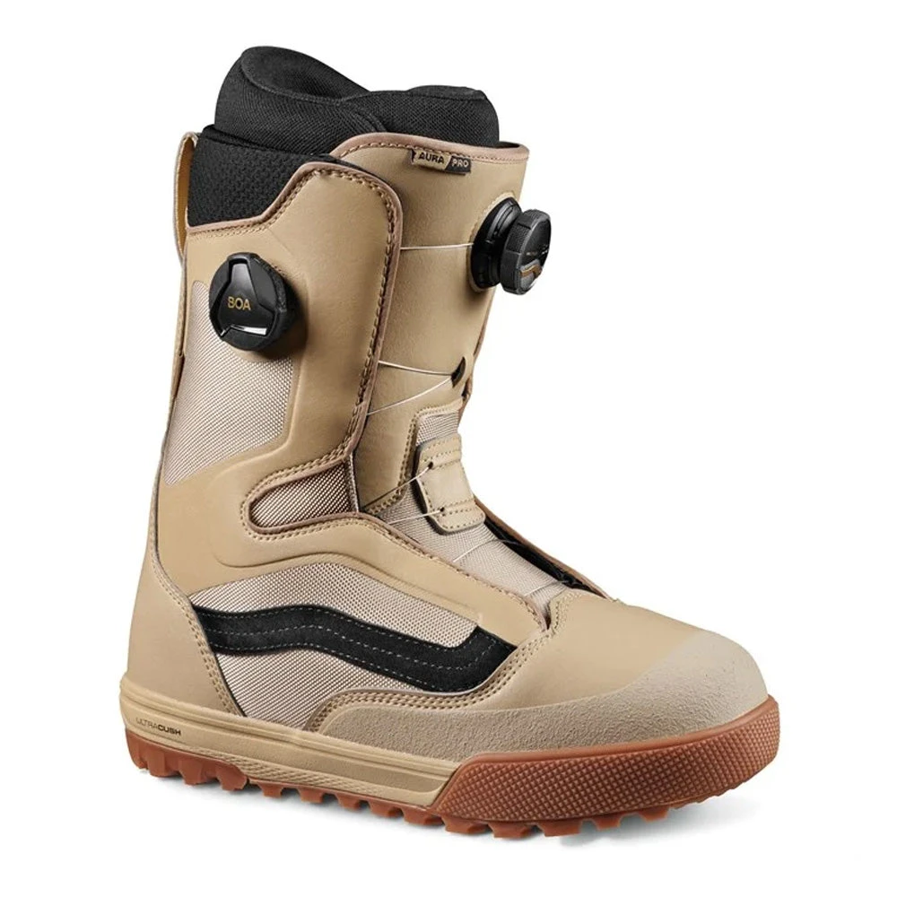 VANS 2023 MENS AURA PRO SNOWBOARD BOOT The Vans Aura Pro Snowboard Boots are a great mid-flexing option with proven performance and the convenience of dual Boa closures. Complete with a V2 UltraCush Smartwool liner and V2 Waffle Pro sole with new All-Trac cold weather rubber, this boot will provide a quality ride for all types of riding. Flex Flex Rating 5 – 6 (1 Soft – 10 Stiff) Instep Flex Zone The Instep Flex Zone functions to maintain natural ankle flexion in your boot, whether in or out of your bindings. Fit Pleasurecuff The supple elasticity of the PleasureCuff delivers a cushioned, comfortable fit that keeps your calves supported. Liner V2 Ultracush with Smartwool Liner This inner features Smartwool merino wool fabric, which transfers and eliminates moisture. An UltraCush layer provides all-day comfort with minimal seams, and a neoprene forefoot gives a natural flex. A dual-density heat-moldable core is bolstered by the latest X-Cage–extra security and heel hold that always keeps you in contact with your board. V2 Boot Harness Customize your heel hold with the V2 harness as it works in tandem with the V2 liner to provide enhanced support and personalized fit. Lacing System Boa Custom Focus Custom Focus features a high-power coiler reel and a mid-power remote reel to control three zones of closure linked by Vans exclusive Custom Slide Guide, delivering concentrated closure around the instep area for focused heel hold. Vans Custom Slide Guide Anatomical shape provides adjustable fit anywhere along the instep area for added comfort and unrivaled heel hold. Footbed V2 POPCUSH Footbed A dual density footbed that combines impact cushioning with energy transfer, the V2 POPCUSH fights fatigue with anatomical shaping, TPU arch support, a nylon moisture-wicking topsheet, and a coring design with airflow perforations. Sole V2 Waffle Pro with All-Trac Rubber Compound The V2 Waffle Pro is a progressively inspired and capability-driven design built for both on and off snowboard performance. Uncompromising natural flex and a weight-reducing, impact-resisting UltraCush midsole provide incredible boardfeel, while a Vans-exclusive pattern and All-Track rubber compound give you the confidence you need to scramble the sidecountry with confidence. Additional Features Heat Retention 360 All Vans snowboard boots feature a newly improved thermal retention layer that provides a 360 wrap of the toe box and between the outsole and the liner. This essential layer keeps heat in and cold out, ensuring all-day warmth and comfort.