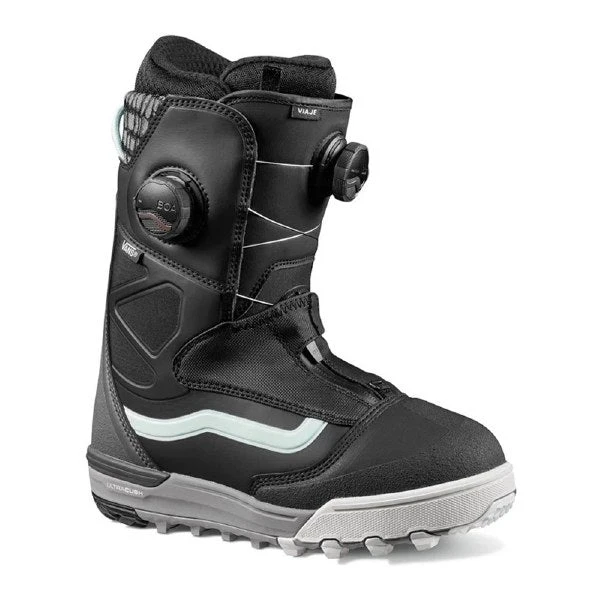 VANS 2023 WOMENS VIAJE SNOWBOARD BOOT The high-end Vans Viaje Snowboard Boots are designed for all-day hard charging comfort, with support and features to make your riding stronger and more comfortable than ever. This is one of the stiffest boots in the Van’s lineup, with a variable flex in the 6-9 zone, and comes with a low gaiter system and breathable valves to keep snow and water vapor away from your feet. A dual Boa Custom Focus Plus closure system allows micro adjustment in seconds and gives you exactly the support and heel hold you need. Wherever in the world you Viaje takes you, these boots will handle the foot to board juncture in style. Flex Flex Rating 6 – 9 (1 Soft – 10 Stiff) Van’s Flex Control System Our removable, high-rebound Hytrel tongue stiffeners enable riders to custom-tune their boot flex. Keep both in for maximum support, use just one for increased lateral or medial response, or take them both out for a softer-flexing boot. As your boots soften up over time, add the tongue stiffeners back in to extend the life of your boots. Instep Flex Zone The Instep Flex Zone functions to maintain natural ankle flexion in your boot, whether in or out of your bindings. Asymmetrical Flex Zone Liner V3 UltraCush Liner with FlashDry UltraCush interior cushioning layer with The North Face FlashDry for superior wicking performance Expanded Comfort Flex neoprene forefoot Updated X-Cage for superior heel hold Dual-density, heat-moldable core Closed-seam microsuede cuff and tongue Lacing System Boa Custom Focus Plus Custom Focus Plus features two high-power (H4) dials that control three zones of fit linked by Vans exclusive Custom Slide Guide, delivering concentrated fit around the instep area for superior heel hold. Footbed V2 Popcush Footbed Dual-density construction TPU arch support heel clip provides stability while allowing torsional flex Advanced 3D-molded anatomical shape Anti-fatigue coring design Airflow perforations Nylex moisture-wicking top sheet Sole V3 Superenduro Waffle Outsole with All-Trac Rubber Inspired by the extended cross- country and off-road demands of moto enduro racing, the V3 SuperEnduro outsole is designed to offer maximum performance in and out of your bindings. Multi-directional tread design Surface-level texturing A TPU toe pick Check, check, and check. There s no keeping up with this all-terrain apex predator. Additional Features Heat Retention 360 All Vans snowboard boots feature a newly improved thermal retention layer that provides a 360 wrap of the toe box and between the outsole and the liner. This essential layer keeps heat in and cold out, ensuring all-day warmth and comfort. Breathable Valves These waterproof valves allow one-way moisture management by transporting moisture away from your foot, ensuring breathability and thermal regulation for dry, comfortable feet. Waterproof Zipper Shroud and D Ring